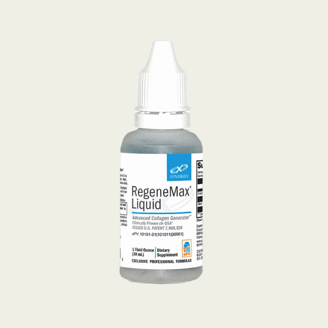 Xymogen Regenemax® Liquid provides clinically studied ch-OSA® (choline-stabilised orthosilicic acid), an advanced collagen generator that supports skin elasticity, hair thickness, nail strength, bone mineral density, and joint health. Highly bioavailable liquid formula for optimal absorption.